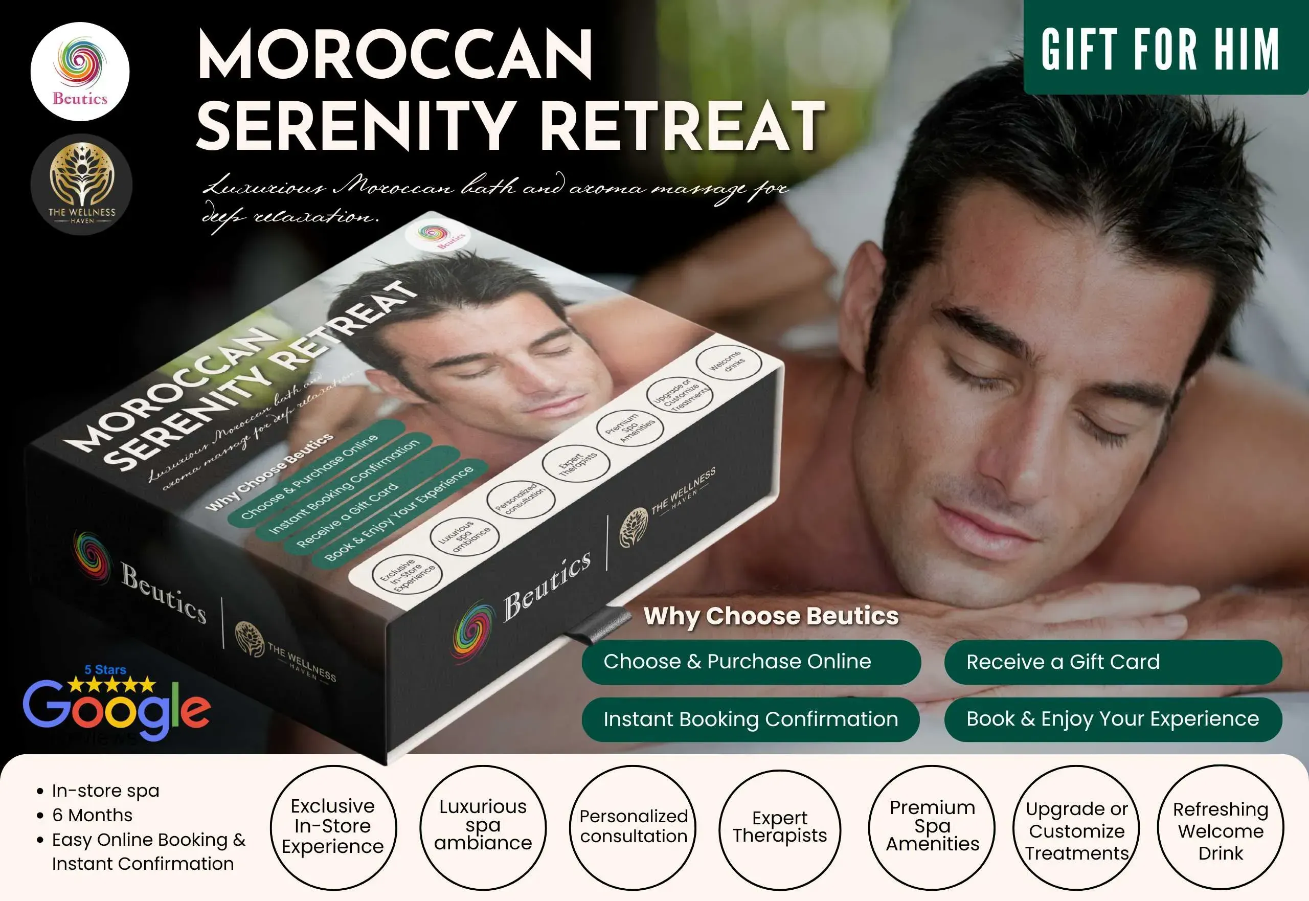 His skin feels rough, his muscles are tense, and stress clings to him like a second skin. It’s time for a reset. The Moroccan Serenity Retreat is the ultimate way to refresh both body and mind.